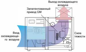 Охлаждающий воздух всасывается отдельным вентилятором и в первую очередь охлаждает секцию электрооборудования и привода.