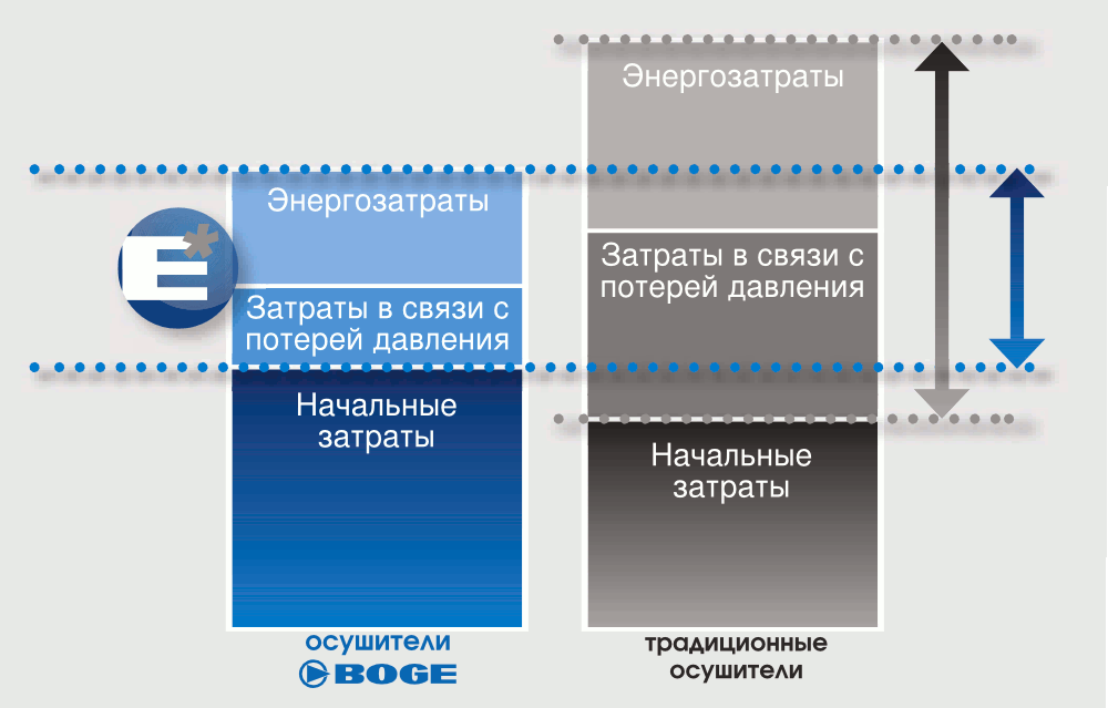 Когда дело доходит до энергоэффективных осушителей сжатого воздуха, имеет значение не только потребление энергии самим осушителем, но и в ещё большей степени потребляемая мощность компрессора. Даже небольшое сокращение потерь давления через осушитель означает снижение необходимого входного давления, что в свою очередь экономит энергию.