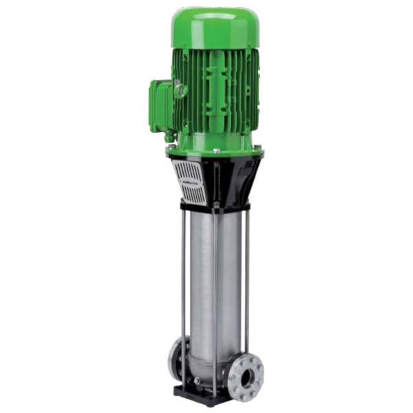 Вертикальные многоступенчатые насосы с линейным расположением патрубков, фланцевым присоединением к трубопроводу и электродвигателем стандарта IEC. Исполнение — литая нержавеющая сталь AISI 304.