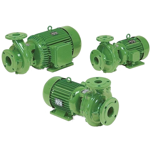 Одноступенчатые моноблочные насосы с осевым всасыванием, тангенциальным нагнетанием и импеллером, зафиксированным шпонками на валу электродвигателя.