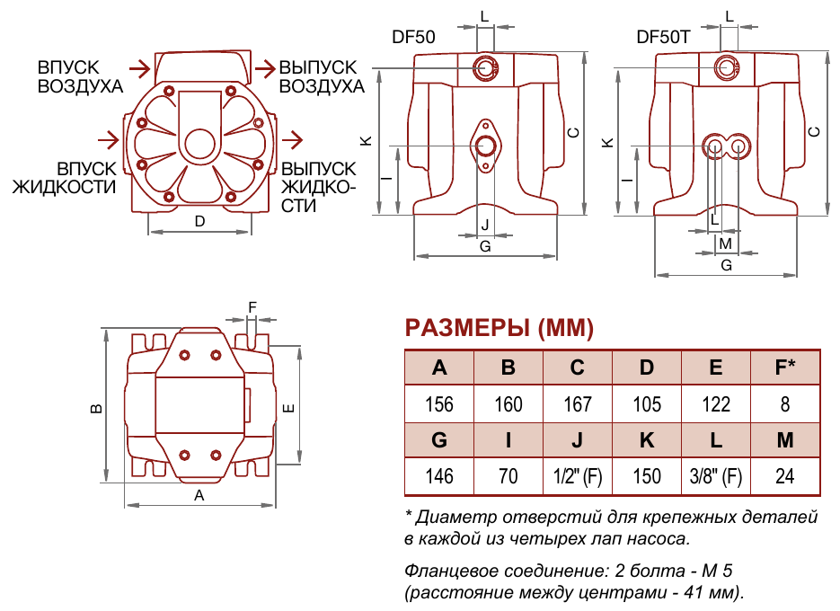 Модель DF50T - это насосы с двойным входом, предназначенные для смешивания жидкостей с одинаковой вязкостью. Обе исходные жидкости и полученная смесь должны быть совместимы со смачиваемыми материалами насоса.