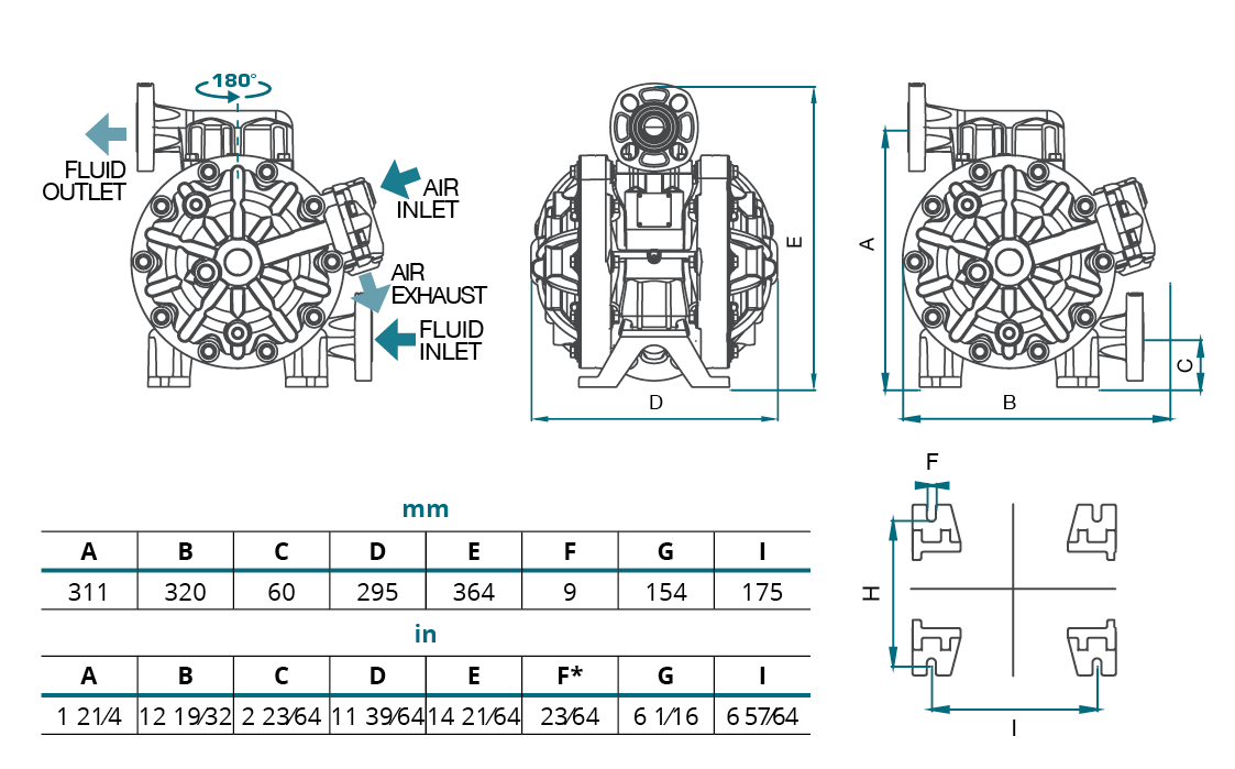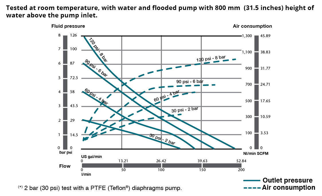 Возможность работы с широким диапазоном давлений сжатого воздуха обеспечивает хорошие дозирующие способности насоса. Материалы проточной части совместимы даже с наиболее агрессивными химическими растворами, что позволяет применять эти насосы в коррозионно активной среде. Воздушный привод (воздушный клапан и крышки воздушной камеры) выполнен из полипропилена.