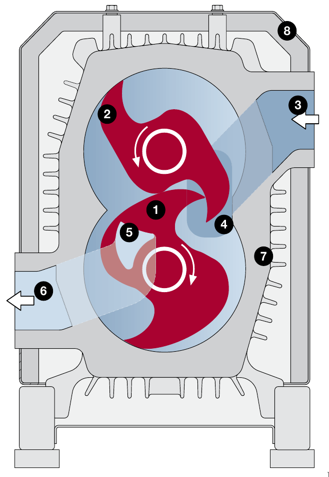 Когда роторы вращаются, воздух перемещается со стороны всасывания на сторону нагнетания. Затем он сжимается за счет уменьшения объема между роторами до тех пор, пока нижний ротор не откроет выпускной канал 5. Такое «внутреннее сжатие» обеспечивает высокий перепад давлений при эффективности свыше 60 %. После этого предварительно сжатый воздух выходит через выпускное соединение 6. Для того, чтобы удалить тепло, выделяющееся в процессе сжатия, охлаждающий воздух засасывается между корпусом 7 и звукоизолирующим кожухом 8, и затем выбрасывается наружу.