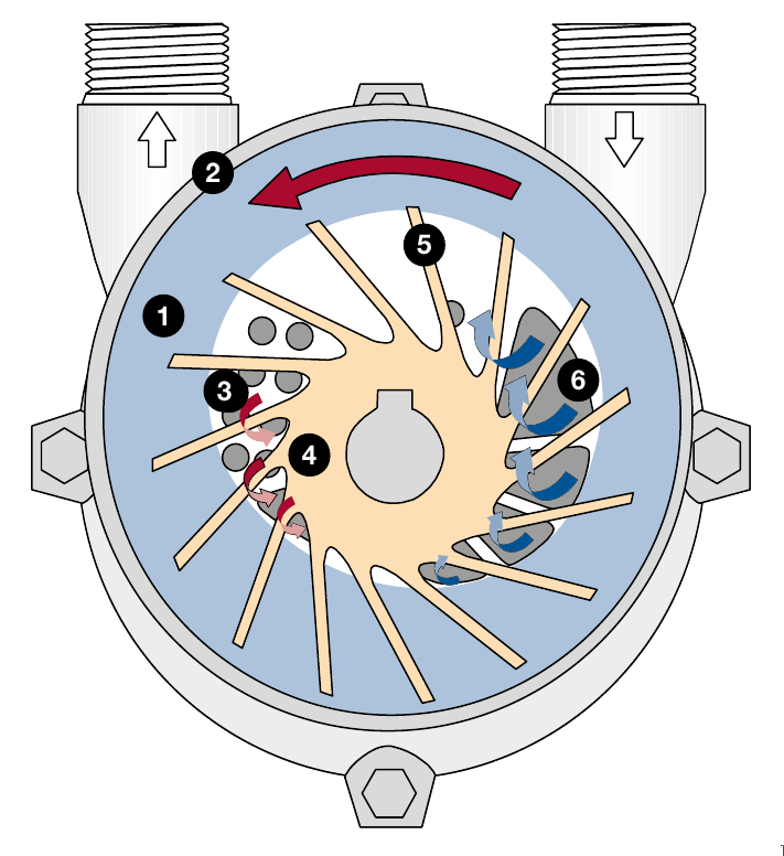 Крыльчатка 4 с эксцентриковым креплением является единственной подвижной частью внутри насоса. Она вращается без контакта внутри корпуса насоса 2. Вращающееся жидкостное кольцо 1 герметизирует рабочее колесо и прижимает его лопасти друг к другу. Через порт всасывания 6 газ поступает в лопастные ячейки. Для поддержания стабильности жидкостного кольца жидкость также постоянно всасывается в камеру сжатия и удаляется через порт нагнетания 3 вместе с транспортируемым газом. Эксцентриковое расположение импеллера внутри корпуса создает попеременно камеры сжатия между лопастями 5 во время вращения, что вызывает сжатие транспортируемого газа в течение полного оборота.
