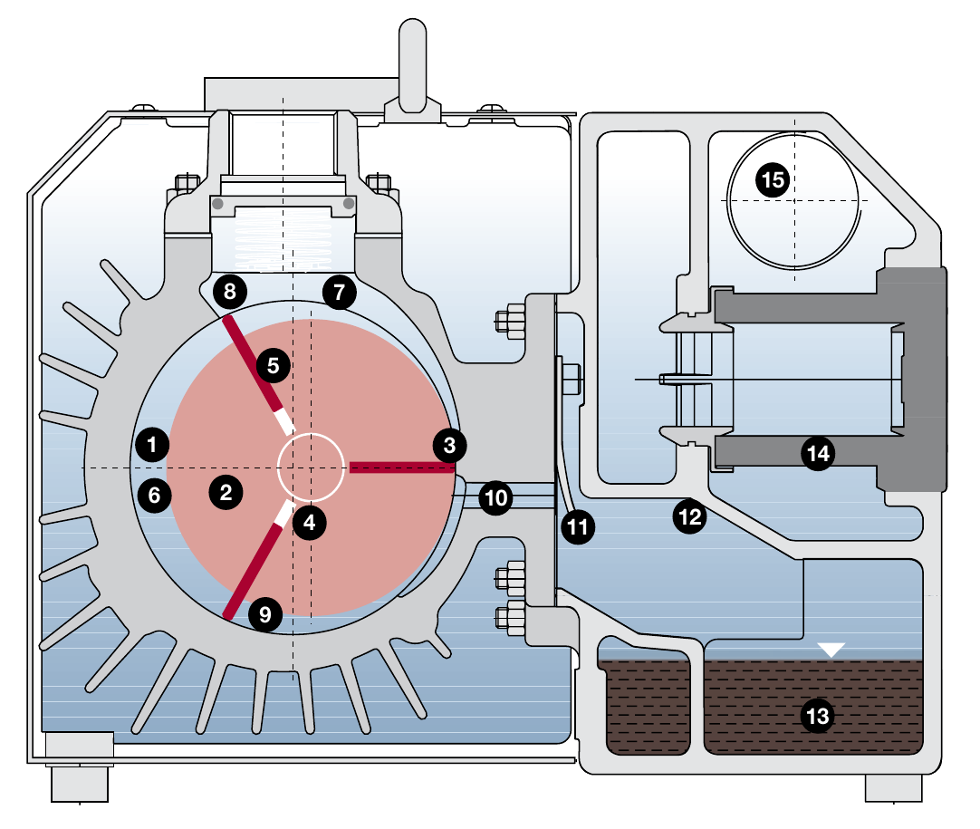 В цилиндрическом корпусе 1 ротор 2 расположен эксцентрично, так что он находится сверху, почти соприкасаясь с цилиндром 3. Лопасти или роторные лопатки 5, как они называются, расположены внутри пазов ротора 4. Когда ротор начинает вращаться благодаря центробежной силе, лопатки выбрасываются из пазов и скользят по внутренней поверхности цилиндра.